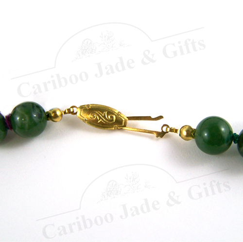 6mm British Columbia Nephrite Jade beads strung in a pattern with freshwater pearls and gold tone beads. Necklace is has a gold plated hook style safety clasp. 24″ length including clasp.